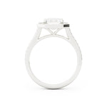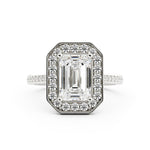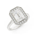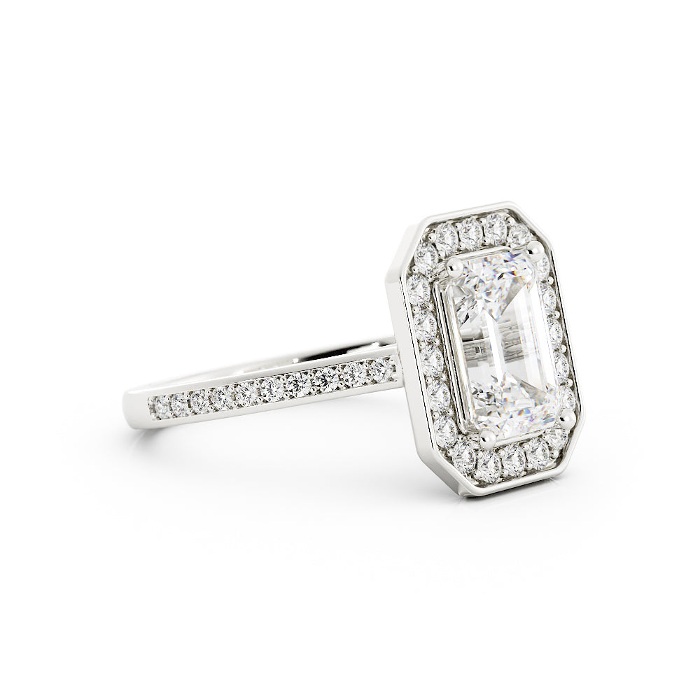 The halo design nestles the emerald-cut diamond securely and will offer a glimmering display of light.