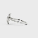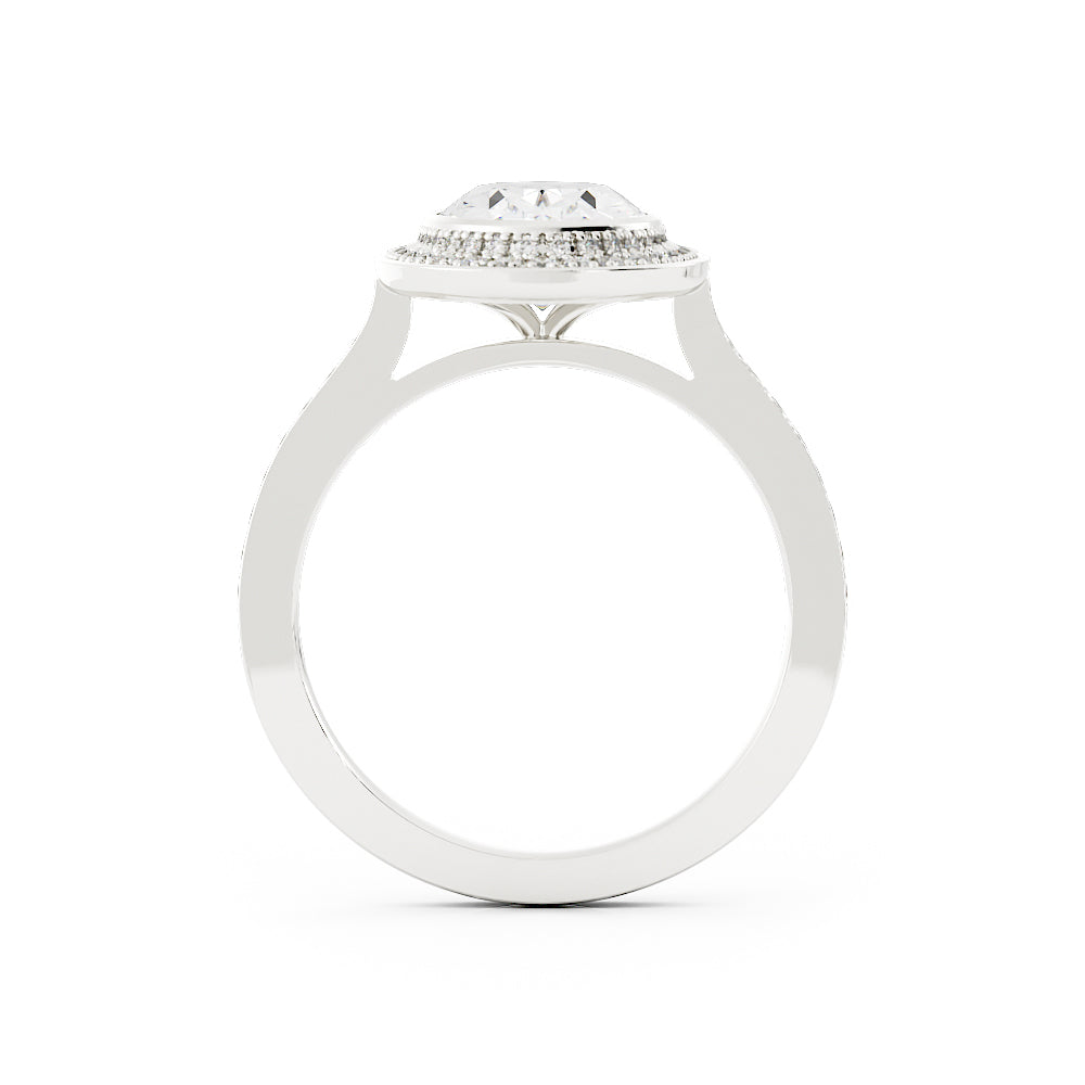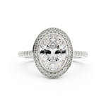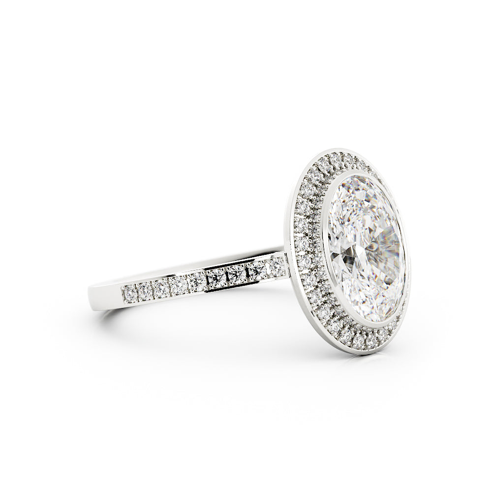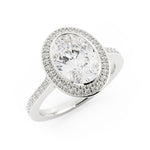 The halo design nestles the oval cut diamond securely and will offer a glimmering display of light.